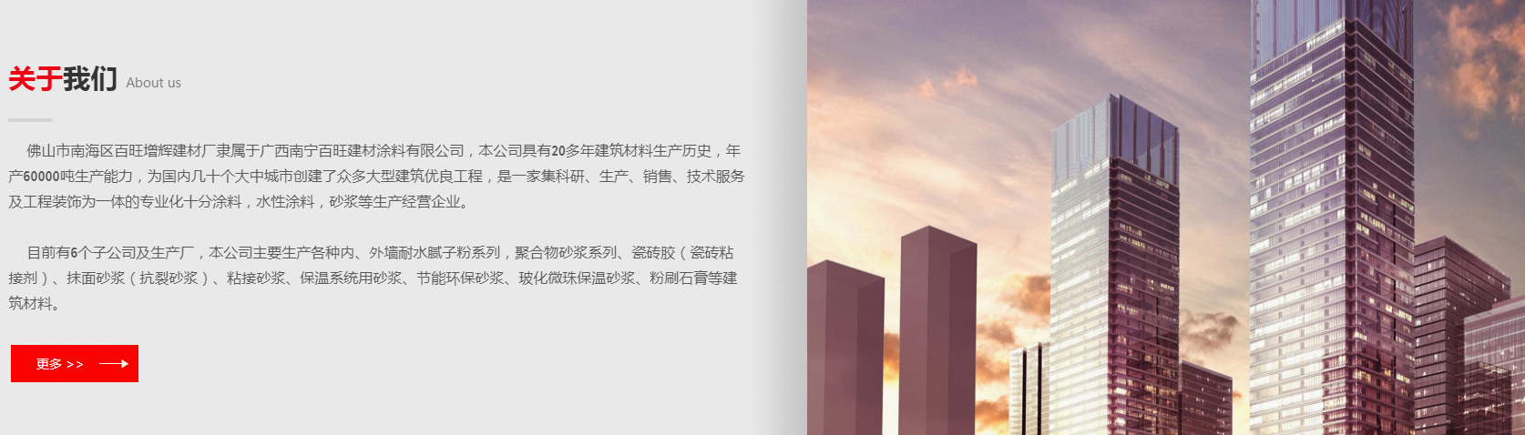 佛山市南海区百旺增辉建材厂隶属于广西南宁百旺建材涂料有限公司,本公司具有20多年建筑材料生产历史,年产60000吨生产能力,为国内几十个大中城市创建了众多大型建筑优良工程,是一家集科研、生产、销售、技术服务及工程装饰为一体的专业化十分涂料,水性涂料,砂浆等生产经营企业。