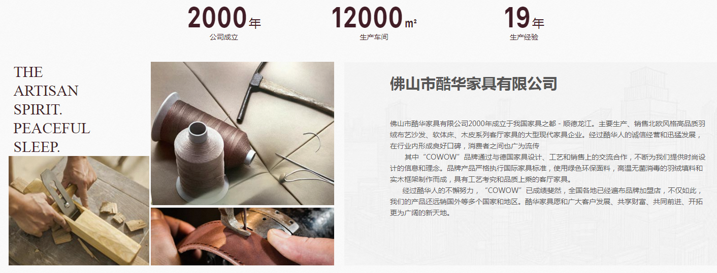 佛山市酷华家具有限公司2000年成立于我国家具之都-顺德龙江。主要生产、销售风羽绒布艺沙发、软体床、木皮系列客厅家具的大型现代家具企业。经过酷华人的诚信经营和迅猛发展,在行业内形成良好口碑,消费者之间也广为流传