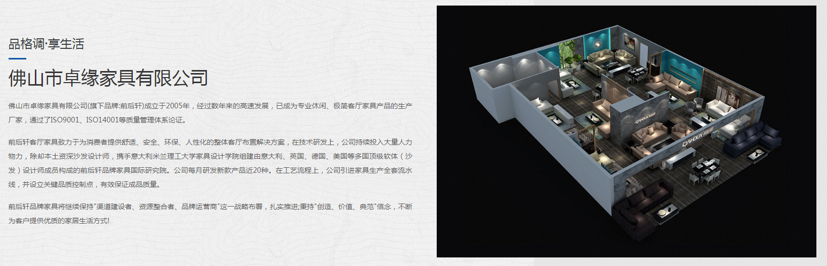 佛山市卓缘家具有限公司(旗下品牌:前后轩)成立于2005年,经过数年来的高速发展,已成为专业休闲、客厅家具产品的生产厂家,通过了ISO9001、ISO14001等质量管理体系论证。