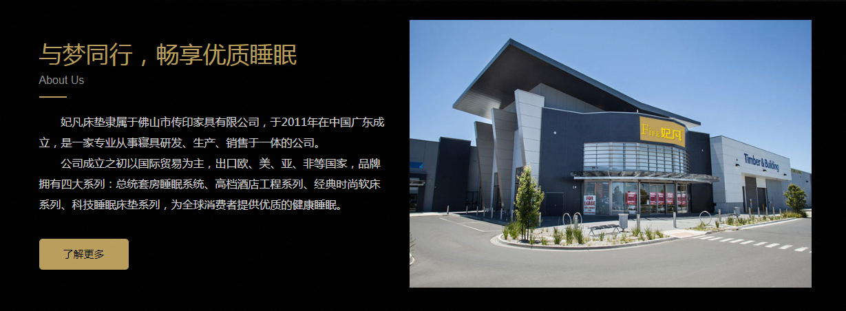 公司成立之初以贸易为主,出口欧、美、亚、非等国家,品牌拥有四大系列:总统套房睡眠系统、酒店工程系列、经典时尚软床系列、科技睡眠床垫系列,为消费者提供的健康睡眠。