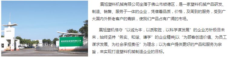 震旭塑料机械有限公司坐落于佛山市顺德区,是一家塑料机械产品研发、制造、销售、服务于一体的企业,凭借着品质,价格,及周到的服务,受到广大国内外新老客户的青睐,使我们产品占有广阔的市场。