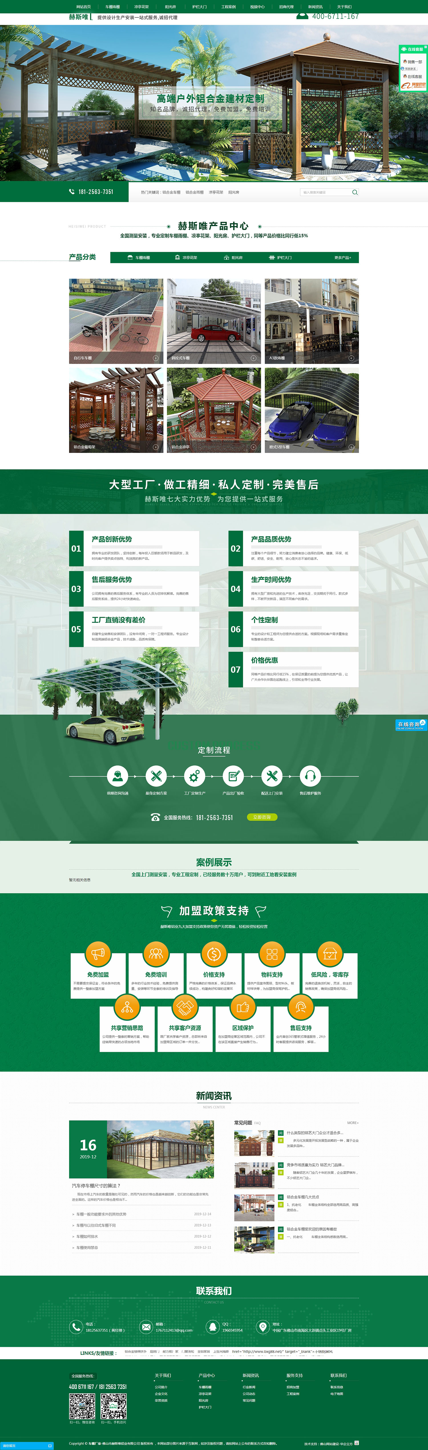 佛山市赫斯唯铝业有限公司位于中国铝材之都,是集生产、销售、设计、制作、安装服务于一体的专业化生产厂家,可以提供成品和型材批发。以别墅配套新型建材领域为主体,专注于美化、环保、节能的设计理念,引进德国生产工艺,严格按标准生产。吸收行业内先进技术和经验,选用优质型材和配件,不断推出铝艺新品。主要生产铝合金车棚、铝合金雨棚、铝合金葡萄架、铝合金阳光房、铝艺别墅大门、铝合金护栏围栏、全铝家具等铝制产品。产品具有防腐防虫、使用寿命长抗老化、坚固耐用、抗风压能力强、易保养等特点。