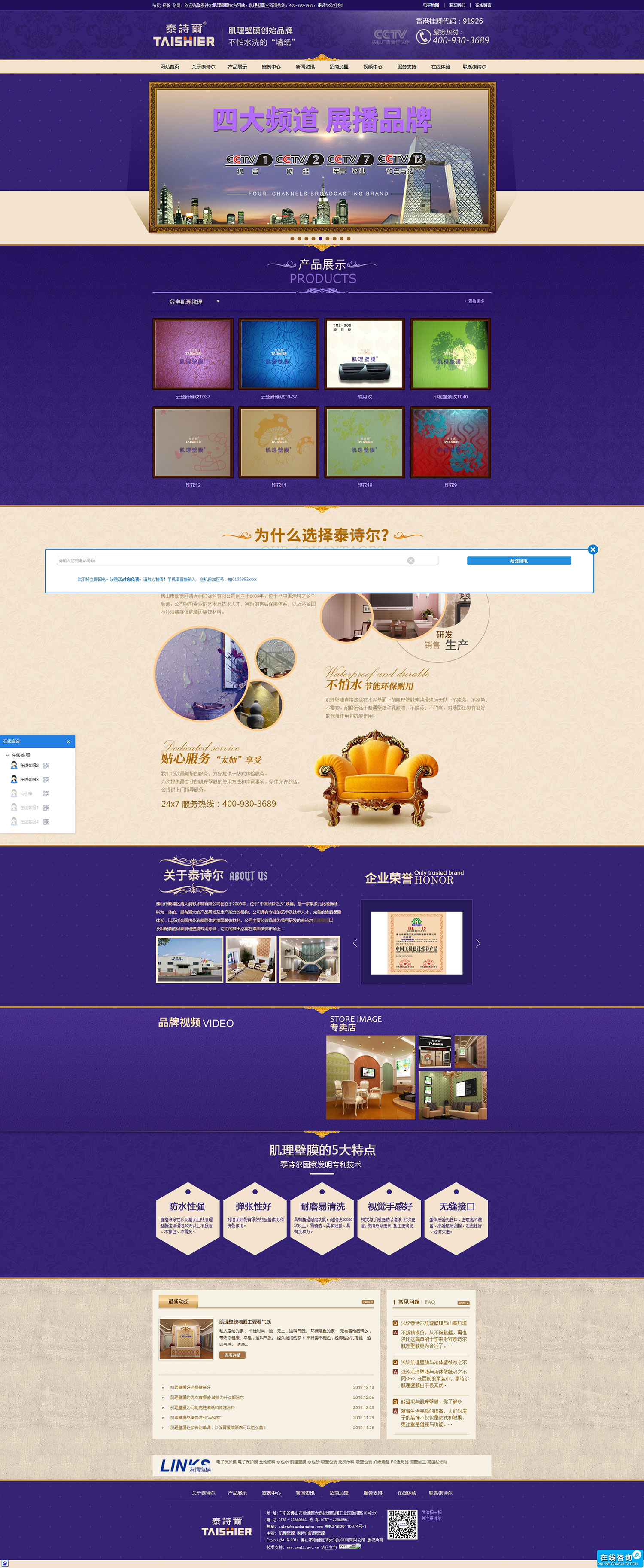 佛山市顺德区清大润彩涂料有限公司研发的泰诗尔肌理壁膜是国家发明专利产品。其壁膜浆+工艺构成的肌理壁膜装饰效果酷似墙纸,但它与墙纸不同的是更为环保,更加节能,更持久耐用,性价比更具优势,并能克服一般涂料及墙纸普遍存在的各种弊端,它具有绿色环保、耐水防霉、附着力好、经磨耐擦、装饰性强、施工简便等特点,是一种集高新科技与高雅艺术为一体的新型墙面装饰产品,它的问世必定成为墙面装饰艺术的新潮流。