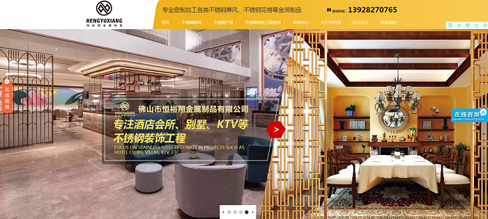 佛山市恒裕翔金属制品有限公司是一家集设计,加工,销售为一体的整合型的不锈钢制造商,生产加工经验相当丰富。公司秉着以质量求发展,以诚信赢天下的宗旨,现有高档真空离子散件电镀炉2台,6米剪折刨设备,专业加工销售不锈钢非标制品为主,主要生产各种不锈钢装饰屏风,酒柜,KTV茶几,展示架,博古架,栏杆扶手,不锈钢拉手,不锈钢雕塑,金属艺术品,铝铜雕塑制品,酒店家具配套五金,承接:酒店,会所,别墅,KTV,不锈钢装饰工程。