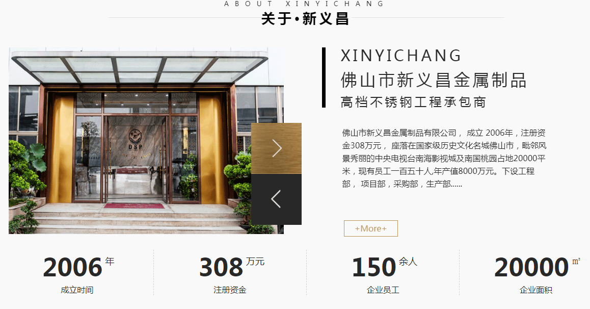 佛山市新义昌金属制品有限公司,成立于2006年,注册资金308万元,座落在历史文化名城佛山市,毗邻风景秀丽的南海影视城及南国桃园占地20000平米,现有员工一百五十人,年产值8000万元;下设外贸部、预结算部、工程部、项目部、综合生产部、焊接部、激光切割部、财务部、采购部、行政部、折弯部、质管部。本公司致于不锈钢装饰工程行业文化的发展,并拥有一批高素质的工程技术人员,技术力量雄厚,公司下属多支专业不锈钢装饰工程施工队伍,三个大型钣金机加工车间和完善的售后服务队伍。公司拥有数控机床(剪、刨、冲、折)、激光切割、精密激光焊接等硬件设备;公司经过数年发展,拥有丰富的不锈钢装饰装修经验,且在行业内拥有较高的声誉,是集设计、生产、加工、制作、安装于一体的专业不锈钢装饰工程公司。
