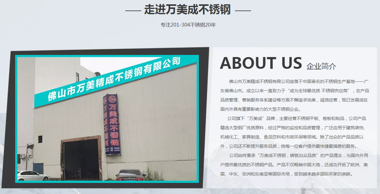 佛山市万美精成不锈钢有限公司座落于的不锈钢生产基地——广东省佛山市。在产品品质管理、营销服务体系建设等方面不懈追求,诚信经营,现已发展成在国内外具有重要影响力的大型不锈钢企业。