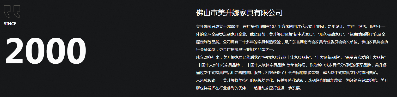 美升娜家居成立于2000年,在广东佛山拥有10万平方米的自建花园式工业园,是集设计、生产、销售、服务于一体的全屋全品类定制家具企业。截止目前,美升娜已涵盖新中式家具、现代家具、健康睡眠寝具以及全屋定制等品类。公司拥有二十多年的家具制造经验,是广东省湖南商会家具专业委员会会长单位、佛山家具协会执行会长单位,更是广东家具行业。