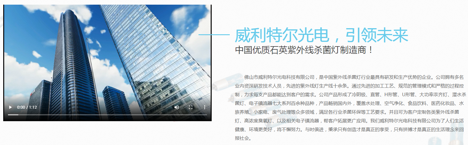 佛山市威利特尔光电科技有限公司,是紫外线灯行业具有研发和生产优势的企业。公司拥有多名业内研发技术人员,先进的紫外线灯生产线十余条。通过先进的加工工艺、规范的管理模式和严格的过程控制,力求每支产品都能达到客户的需求。公司产品形成了冷阴极、直管、H形管、U形管、大功率汞齐灯、电子镇流器七大系列百余种品种,产品国内外,覆盖水处理、空气净化、食品饮料、医药化妆品、水族养殖、小家电、废气处理等众多领域,满足各行业等工艺要求。并且可为客户定制各类、高浓度臭氧灯、以及相关电子镇流器,帮客户拓展更广应用。我们威利特尔光电科技有限公司为了人们生活健康、环境更美好,将不懈努力。与时俱进,秉承只有创造才是真正的享受,只有拼搏才是真正的生活理念来回报社会。