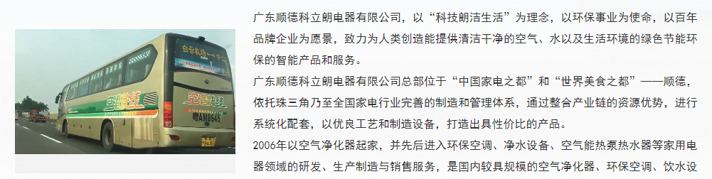 广东顺德科立朗电器有限公司,以“科技朗洁生活”为理念,以事业为使命,以品牌企业为愿景,致力为人类创造能提供清洁干净的空气、水以及生活环境的绿色节能智能产品和服务。
