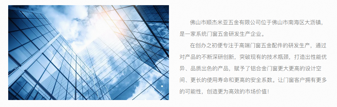 佛山市顺杰米亚五金有限公司位于佛山市南海区大沥镇,是一家系统门窗五金研发生产企业。