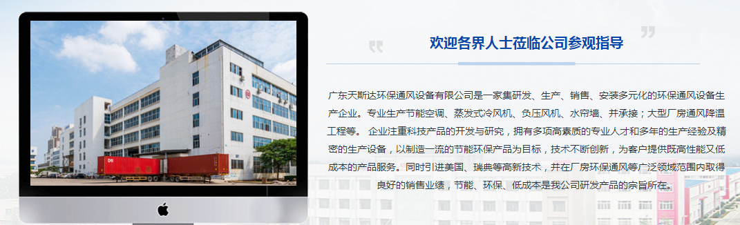 广东天斯达通风设备有限公司是一家集研发、生产、销售、安装多元化的通风设备生产企业。专业生产节能空调、蒸发式冷风机、负压风机、水帘墙、并承接;大型厂房通风降温工程等。 企业注重科技产品的开发与研究,拥有多项高素质的专业人才和多年的生产经验及精密的生产设备,以制造好的节能产品为目标,技术不断创新,为客户提供既高性能又低成本的产品服务。同时引进高新技术,并在厂房通风等广泛领域范围内取得良好的销售业绩,节能、低成本是我公司研发产品的宗旨所在。