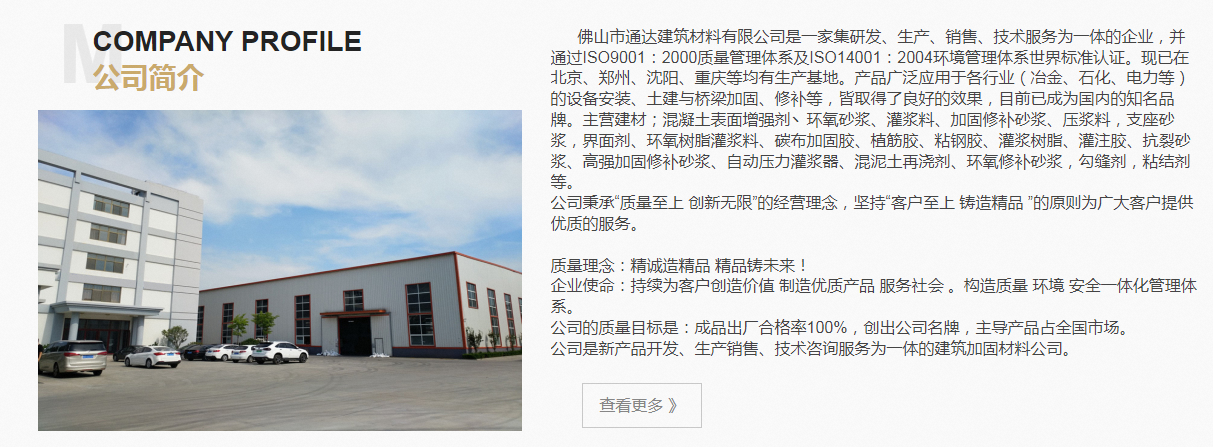 佛山市通达建筑材料有限公司是一家集研发、生产、销售、技术服务为一体的企业,并通过ISO9001:2000质量管理体系及ISO14001:2004环境管理体系世界标准认证。现已在北京、郑州、沈阳、重庆等均有生产基地。产品广泛应用于各行业(冶金、石化、电力等)的设备安装、土建与桥梁加固、修补等,皆取得了良好的效果,目前已成为国内的品牌。主营建材;混凝土表面增强剂丶环氧砂浆、灌浆料、加固修补砂浆、压浆料,支座砂浆,界面剂、环氧树脂灌浆料、碳布加固胶、植筋胶、粘钢胶、灌浆树脂、灌注胶、抗裂砂浆、高强加固修补砂浆、自动压力灌浆器、混泥土再浇剂、环氧修补砂浆,勾缝剂,粘结剂等。