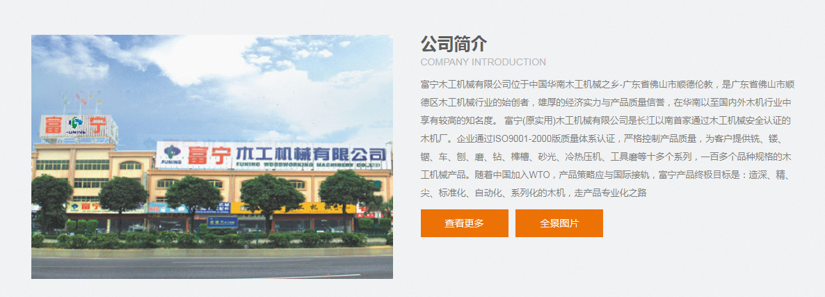 富宁(原实用)木工机械有限公司通过木工机械认证的木机厂。企业通过ISO9001-2000版质量体系认证,严格控制产品质量,为客户提供铣、镂、锯、车、刨、磨、钻、榫槽、砂光、冷热压机、工具磨等十多个系列,一百多个品种规格的木工机械产品。随着加入WTO,产品策略应与国外接轨,富宁产品目标是:造深、精、尖、标准化、自动化、系列化的木机,走产品专业化之路。