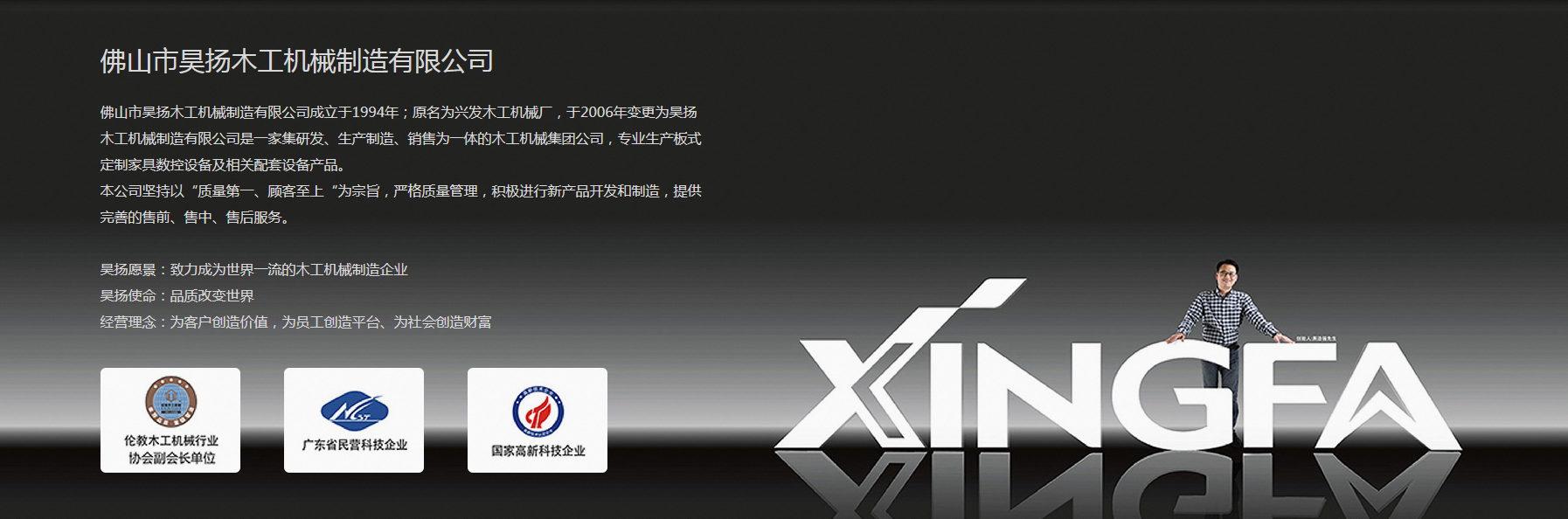 佛山市昊扬木工机械制造有限公司成立于1994年;原名为兴发木工机械厂,于2006年变更为昊扬木工机械制造有限公司是一家集研发、生产制造、销售为一体的木工机械集团公司,专业生产板式定制家具数控设备及相关配套设备产品。
