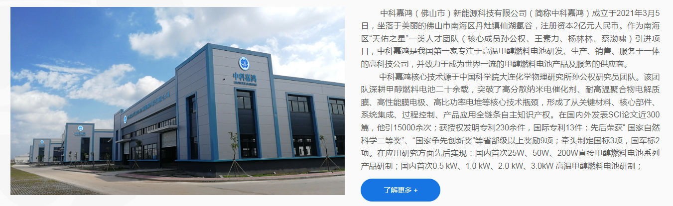 中科嘉鸿(佛山市)新能源科技有限公司(简称中科嘉鸿)成立于2021年3月5日,坐落于美丽的佛山市南海区丹灶镇仙湖氢谷,注册资本2亿元人民币。作为南海区“天佑之星”一类人才团队引进项目,中科嘉鸿是我国一家专注于高温甲醇燃料电池研发、生产、销售、服务于一体的高科技公司,并致力于成为的甲醇燃料电池产品及服务的供应商。