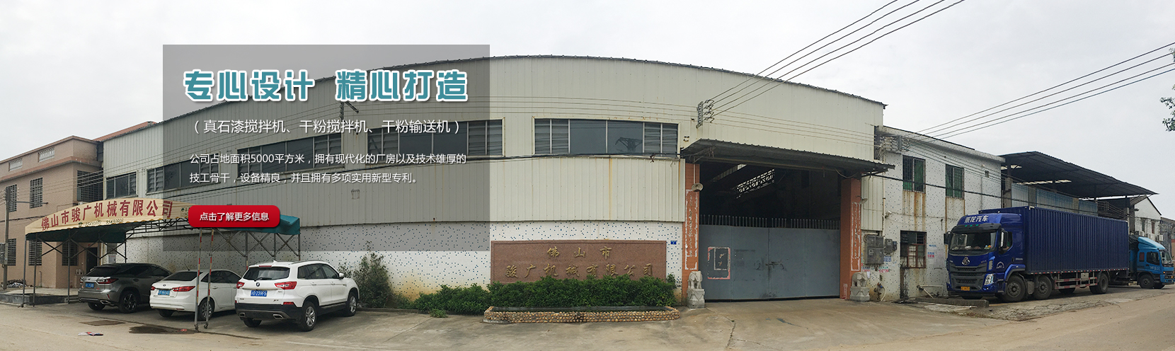 佛山市骏广机械有限公司专业生产:真石漆搅拌机,真石漆混合机的厂家,干粉输送器等机械设备,真石漆设备产品远售到了各地及海外各地。骏广机械有限公司位于有为文化之乡---广东省佛山市南海区丹灶镇,靠近桂丹路、西二环高速、广珠铁路西线、交通方便。公司占地面积5000平方米。是一家生产制造真石漆搅拌机设备的机械企业,真石漆搅拌机从研发到生产制作,每一环节都紧抓产品质量,并且拥有多项国家实用新型专利。多年来,凭着过硬的技术和品质,赢得了广大客户的信任和支持。